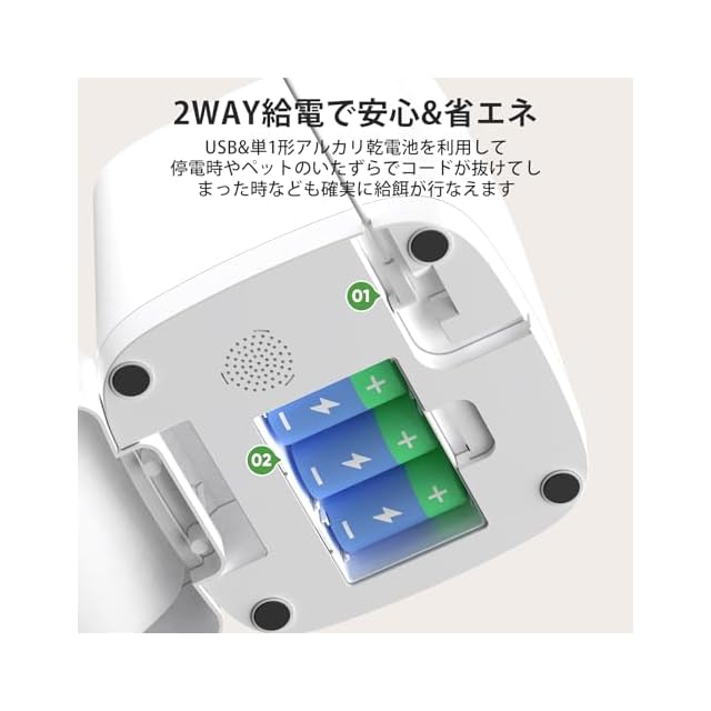 【2WAY給電&停電対策】: 自動給餌器はコンセントとバッテリーで自動給餌器に給電できます。停電やアダプターが外れてしまっても電池から給電して動きます。(電池は含みません)(注意:Wi-Fiは2.4Ghzを使用することが必要です。(2GHz、5GHzは対応できませんので、あらかじめご了承ください。)