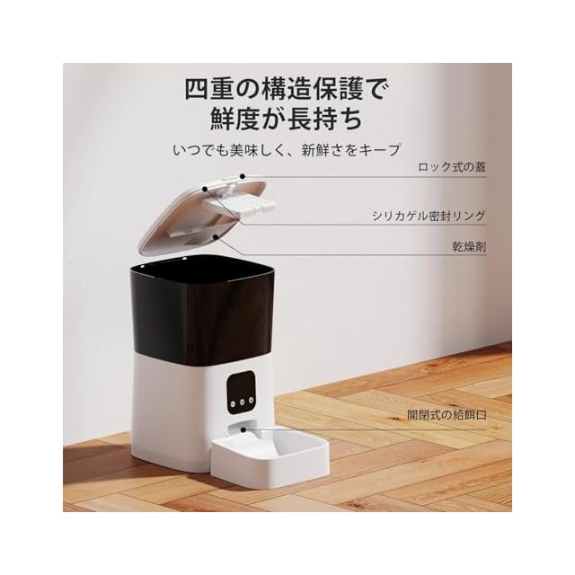 【いつも新鮮で乾燥した餌】密封された容器には乾燥剤パックを内蔵できるため、湿気を防ぎます。ツイストロック式で、ペットのいたずらを防ぎながら餌の鮮度を保ちます。雑菌の繁殖も心配ありません。回転ドアは給餌後すぐに閉じ、虫の侵入やペットの噛み傷を防止します。