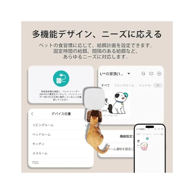 【自動ロック機能】電源が接続された後、または操作が60秒間行われないと、パネルのボタンが自動的にロックされます。パネルのボタンを操作する必要がある場合は、ロック解除ボタンを長押ししてください。(この機能は給餌器のボタンにのみ適用され、スマートフォンの操作には一切影響を与えません。)