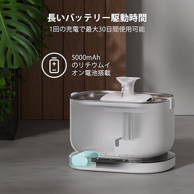 【完全コードレス・置き場所が自由】犬給水器は5000mAhの充電式バッテリーを内蔵、フル充電すると最大30日間使え!電源コンセントの制限を受けなくり、寝室、キッチン、リビングなど猫の好きな場所に自由に水飲み器を置くことができ。また、絡まる配線がないため、配線を整理する手間が省け、家がすっきり!さらに、ペットが電源コードをかじる心配もないので、より安全・安心!*同梱の電源コードからも給電可能、お好きな給電方式を自由に選択。