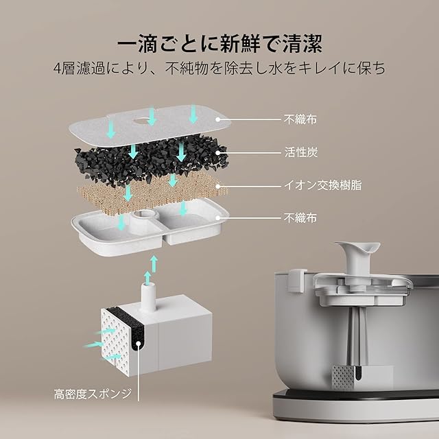 【4重濾過システム・清潔な水を維持】猫が飲む水は、一口一口が新鮮に感じられるため、PETLIBRO猫給水機は4層ろ過システムが搭載された。水から不純物を取り除き、水をより酸素化し、より美味しくする。活性炭が残留塩素を吸着し、異臭をしっかり取り除き、イオン交換樹脂が水道水に含まれる重金属イオンを取り除いて水質を軟化、不織布が猫の毛や不純物をブロックする、内蔵のポンプスポンジがさらにゴミをろ過し、目詰まりやポンプの破損を防ぐ。ペット給水器はいつでも清潔で美味しいお水をペットに与えることができます。(ご注意:本体にセットする前に、活性炭の微粉などがなくなるまで、清水に5分間浸してください)⭐交換フィルターの購入:B0C9JJ9Z7V で検索ください。水飲み器とセットで買うことをオススメ!
