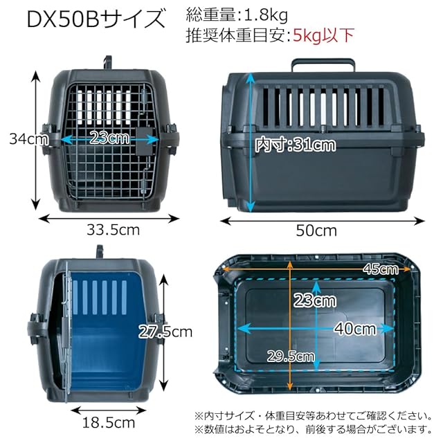 プチリュバン 左右両開きドア ペットキャリーDX50B ブラック M 外寸:幅33.5×高34×奥行50cm クレート ハード ペット キャリーバッグ 超小型犬 小型犬 猫 小動物 左右 両開き IATA基準 飛行機対応 航空輸送ボックス 新幹線 車 プラスチック製 頑丈耐用