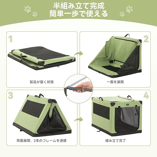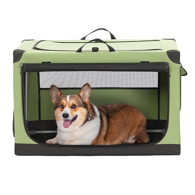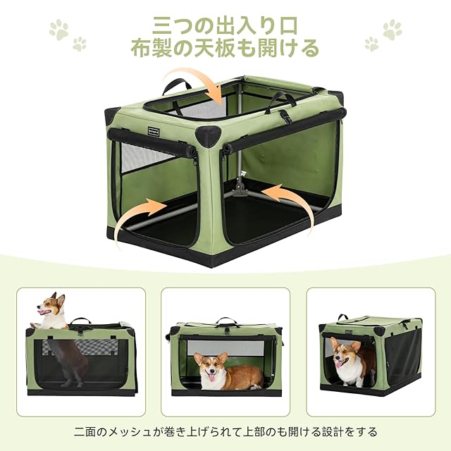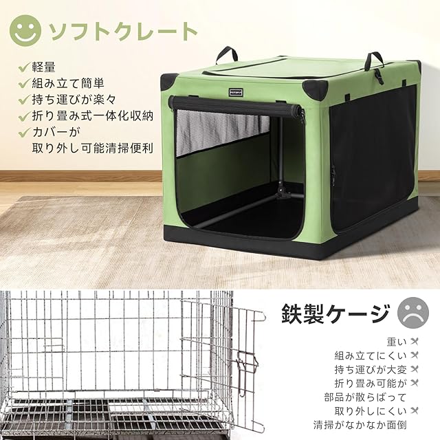 Petsfit ソフトクレート ペットケージ 犬用クレート 中型ペット 折り畳み ペットハウス 猫犬兼用 組み立て簡単 カバーが取り外し可能 ハンドル付き ポケット付き 持ち運び 3つの出し入れ口 通気 しっかり アウトドア 急に来客時 病院 キャンプ M グリーン 76Lx50Wx48.5H