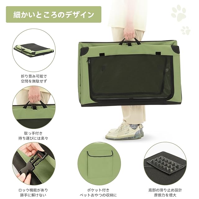 【折りたたみ式】折り畳み式なので、使用しないときは、ベッドやソファーの下などお部屋の隙間に収納でき、スペースを取らず、狭い場所にも安心してお使いいただけます。さらに、収納ポケットが付き、ペットフードやおもちゃなどのペット用品が入れられ、利便性が高いです。