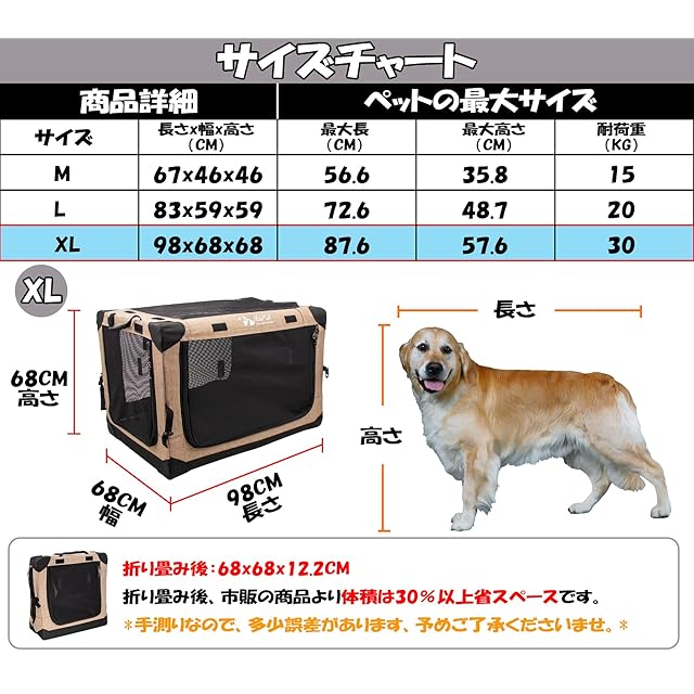【サイズと素材】:XL展開サイズ:長さ98CM、幅68CM、高さ68CM; 収納サイズ:長さ68CM、幅68CM、高さ12.2CM; 素材:600D防水オックスフォード、ナイロン製メッシュ、鉄製フレーム; 耐荷重:30kg;布カバーは完全に取り外し可能で、洗濯機で洗えます、 ペットの健康を守ることができます。