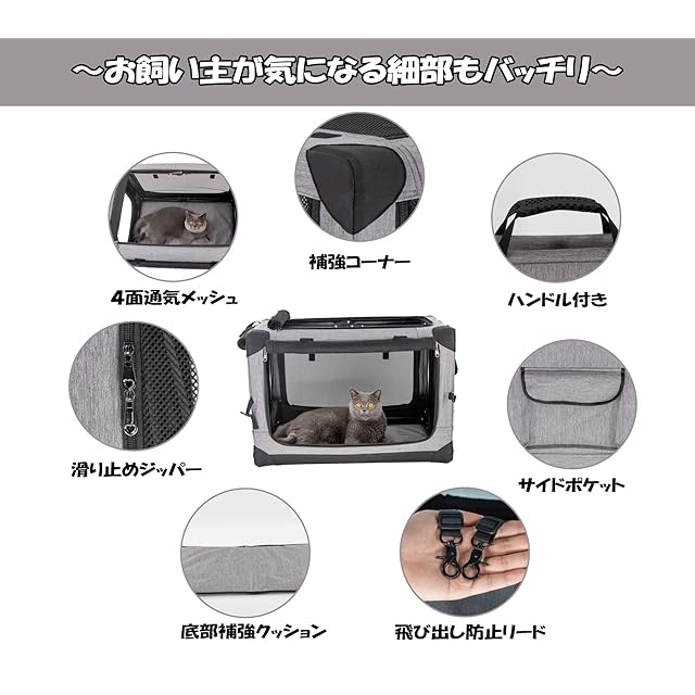 【ペット思いのデザイン】:ポイント①:4面出入口のメッシュで通気性がよくて、暑くならず、蒸れることがなくて、ペットの様子も見えるので安心です。ポイン②:ロック付きジッパーでいたずらの子も安心に使えます。ポイン③:底部補強クッションも完備しており、長旅でも楽です。ポイン④:カバーは取り外せるので、洗濯機で丸洗い可能です。ポイン⑤:側面にサイドポケットが設置されており、おやつや小物などを収納できます。ポイン⑥:中に飛び出し防止リードが付いて安全性が更に向上。