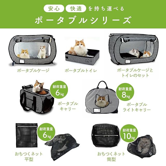 【撥水加工で簡単お掃除&お手入れ】ポータブルケージに使用している生地には撥水加工がされています。猫が中で粗相をしてしまっても、サッと拭くだけできれいにでき、お手入れ簡単で清潔な空間をキープできます。(フリースマットのフリース面を除く)ポータブルトイレ内部の黒い布部分は防水仕様になっています。直接猫砂を入れての使用もOK。汚れが中に染み込んでいかないので、サッと拭き取るだけでお掃除できます。水洗いも可能です。(洗濯機のご使用はお避けください)