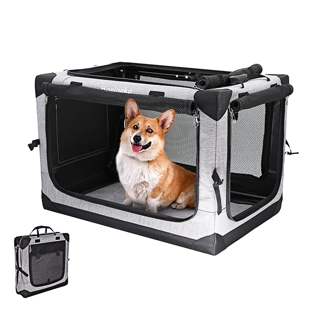 Hapineko 多用途 ペット ソフトクレート ソフトケージ ペットハウス カバー取り外せる 4面メッシュ出入口 折りたたみ式 ロック付きファスナー 鉄フレーム 600D防水オックスフォード 洗濯可能 猫犬兼用 (L, グレー)