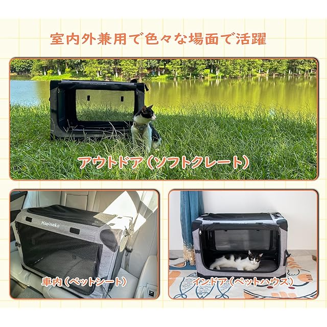 【新型ペットクレート】:独特な折りたたみ式デザインで、4つのバックルを締めたり解除したりするだけで簡単に取り付け・保管できます。他のペットクレートやコンテナと比較して、軽量かつ持ち運びが簡単で工具不要で組み立ても数秒で完了します。「市販のコンテナより30%以上省スペースです。」