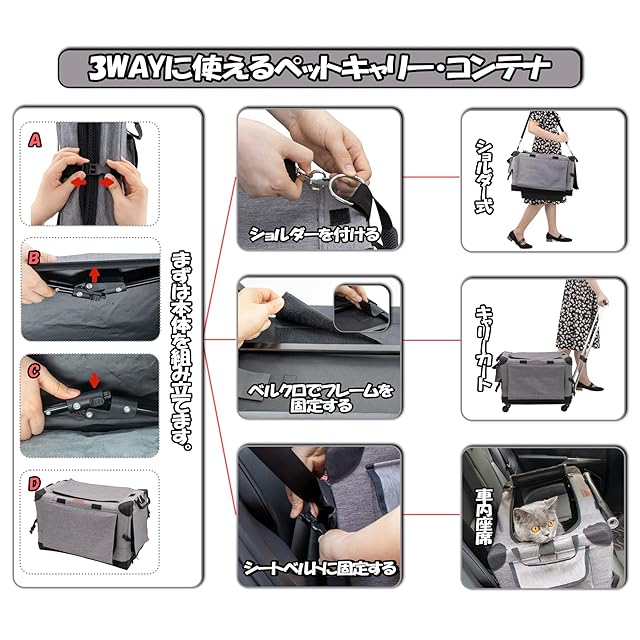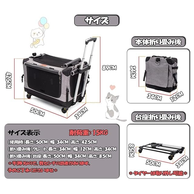 【お飼い主も楽に使える】:ポイン①:クッション付き肩ベルトも完備しており、お飼い主も楽に使えます。ポイン②:組み立ては工具不要で3分間に出来上がります。ポイン③:収納はとても簡単でスペースも取らないです。「市販のコンテナより30%以上省スペースです。」