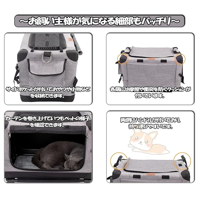【ペット思いのデザイン】:ポイント①:3面出入口のメッシュで通気性がよくて、暑くならず、蒸れることがなくて、ペットの様子も見えるので安心です、しかもカーテン付きで臆病な子も大丈夫です。ポイン②:ロック付きジッパーでいたずらの子も安心に使えます。ポイン③:表面の柔らかい底部補強クッションも完備しており、長旅でも楽です。ポイン④:カバーは取り外せるので、洗濯機で丸洗い可能です。ポイン⑤:側面にサイドポケットが設置されており、おやつや小物などを収納できます。ポイン⑥:中に飛び出し防止リードが付いて安全性が更に向上です。