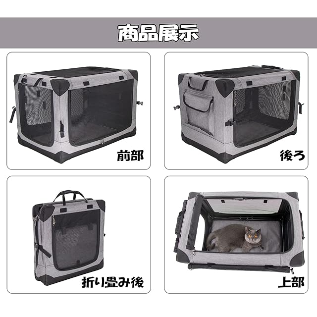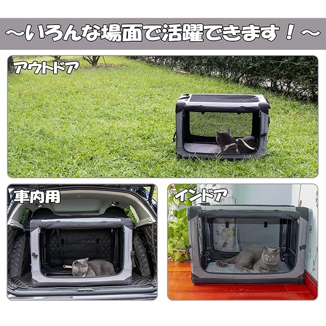 【ペット思いのデザイン】:ポイント①:4面出入口のメッシュで通気性がよくて、暑くならず、蒸れることがなくて、ペットの様子も見えるので安心です。ポイン②:ロック付きジッパーでいたずらの子も安心に使えます。ポイン③:底部補強クッションも完備しており、長旅でも楽です。ポイン④:カバーは取り外せるので、洗濯機で丸洗い可能です。ポイン⑤:側面にサイドポケットが設置されており、おやつや小物などを収納できます。ポイン⑥:中に飛び出し防止リードが付いて安全性が更に向上。