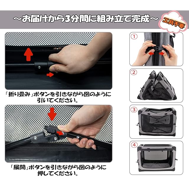 【次世代ペットクレート】:ユニックな折り畳み式のデザインで、取り付けと保管を行うには、4つのバックルを締めたり解除したりするだけです。市販されている他のペットクレートやペットコンテナなどと比較して、このモデルは保管時に軽く、持ち運びが簡単です、組み立ても工具不要で数秒で完成できます。