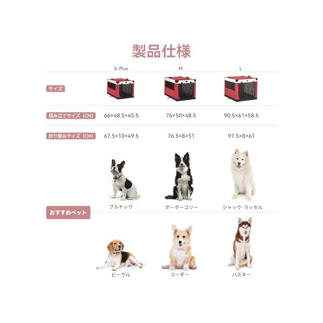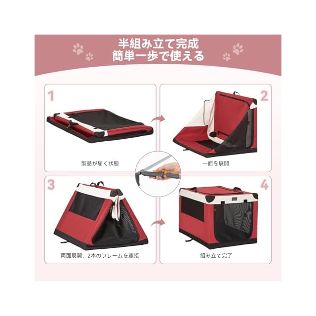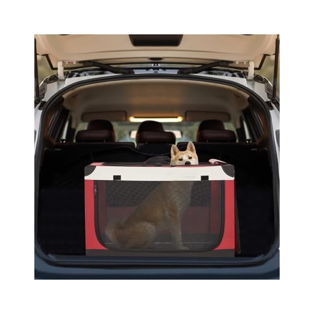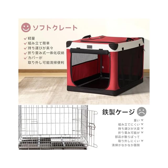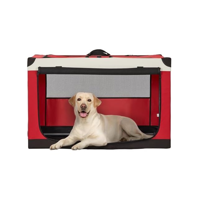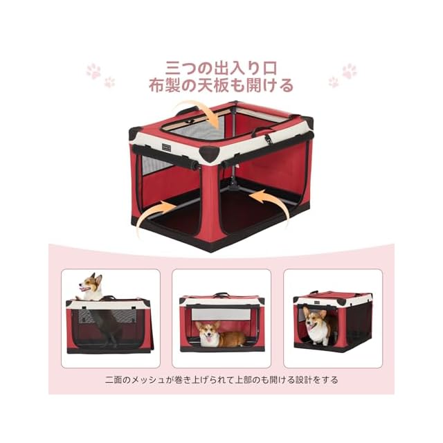 Petsfit ソフトクレート ペットケージ 犬用クレート 中型ペット 折り畳み ペットハウス 猫犬兼用 組み立て簡単 カバーが取り外し可能 ハンドル付き ポケット付き 持ち運び 3つの出し入れ口 通気 しっかり アウトドア 急に来客時 病院 キャンプ L レッド 90Lx61Wx58.5H