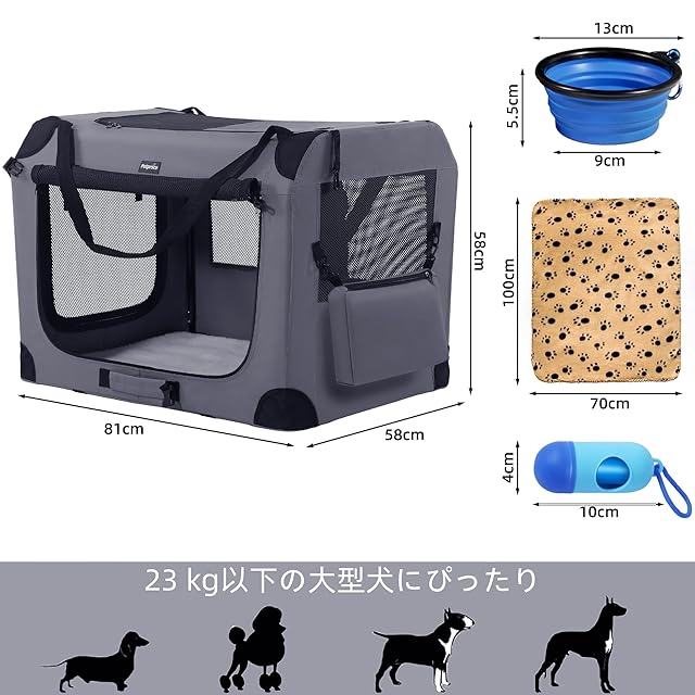 Petprscoソフト折りたたみ式犬用クレート 頑丈耐久81x58x58cmセンチメートルポータブル旅行犬クレート 柔らかい毛布、ドッグボウルとうんち袋と犬のエンクロージャ 中型犬用 屋内と屋外の使用
