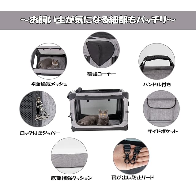 【ペット思いのデザイン】:ポイント①:4面出入口のメッシュで通気性がよくて、暑くならず、蒸れることがなくて、ペットの様子も見えるので安心です。ポイン②:ロック付きジッパーでいたずらの子も安心に使えます。ポイン③:底部補強クッションも完備しており、長旅でも楽です。ポイン④:カバーは取り外せるので、洗濯機で丸洗い可能です。ポイン⑤:側面にサイドポケットが設置されており、おやつや小物などを収納できます。ポイン⑥:中に飛び出し防止リードが付いて安全性が更に向上。