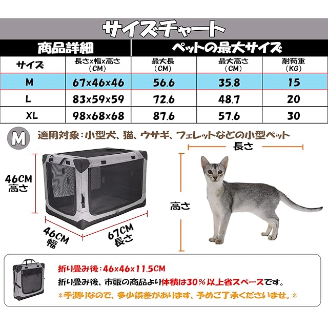 【サイズと素材】:M展開サイズ:長さ67CM、幅46CM、高さ46CM; 収納サイズ:長さ46CM、幅46CM、高さ12CM; 素材:600D防水オックスフォード、ナイロン製メッシュ、鉄製フレーム; 耐荷重:15kg;布カバーは完全に取り外し可能で、洗濯機で洗えます、 ペットの健康を守ることができます。
