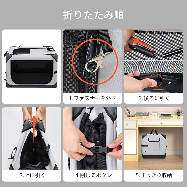 【実用性・多機能】①給水ボトルバンド付き:おでかけ先でも便利な給水ボトルが取り付けられるバンド付き;②ロック付きジッパーでいたずらの子も安心に使えます;③様子が見える四面メッシュ:愛犬の様子が一目でわかる、扉は巻き上げて固定できる;④中に飛び出し防止リードが付属しており、より安全に使用できます;⑤キャリーケース片側にはペットのスナックやおもちゃを置くのに使えるポケットがある;⑥四隅に衝撃吸収パッドが設置されており、キズを予防するとともに家具や車内も保護します。