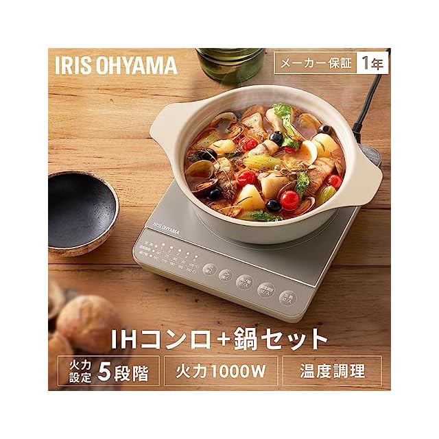 アイリスオーヤマ IHコンロ1000W鍋セット IHKP-T39220-T ブラウン