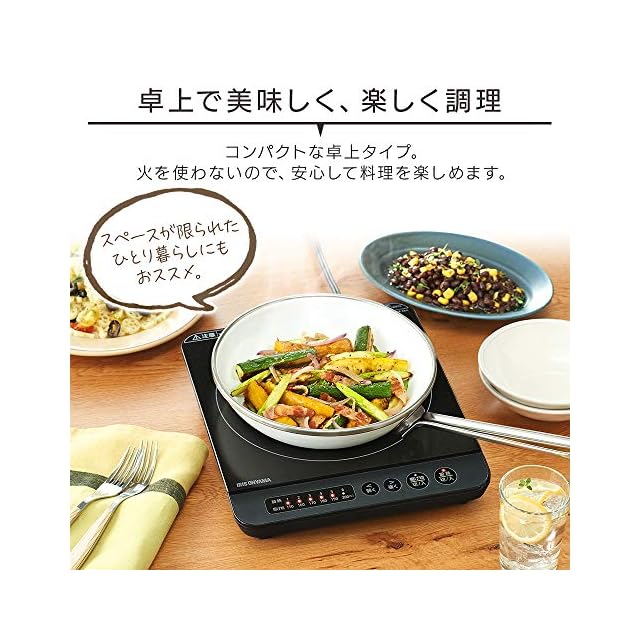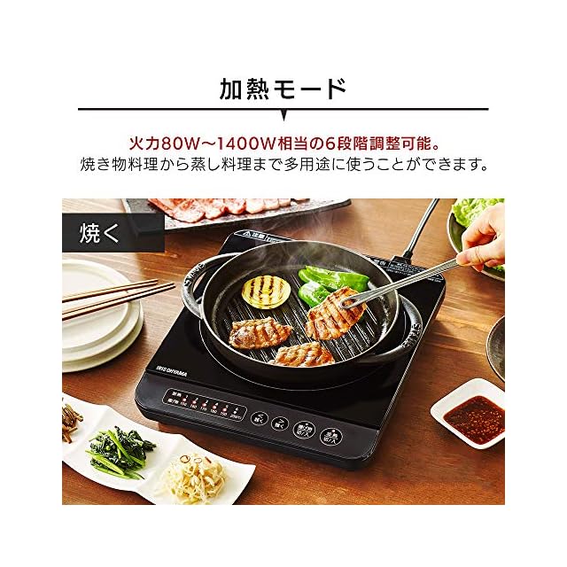 コンパクトな卓上タイプ。<br>火を使わないので、安心して料理を楽しめます。<br><br>最大火力1400Wのハイパワーと2種類のモード選択で、料理の幅が広がります。<br>◆加熱モード<br>火力80W~1400W相当の6段階調整可能。<br>焼き物調理から蒸し料理まで多用途に使うことができます。<br>◆揚げ物モード<br>温度調整が難しい揚げ物調理も、150~200℃の6段階で設定可能。<br><br>安心して使える安全機能<br>・なべ検知機能<br>・なべなし検知機能<br>・小物検知機能<br>・切り忘れ防止機能<br>・トッププレート過熱防止機能<br><br>フラットなガラストップでお手入れ簡単。<br>汚れてもサッと拭くだけですぐキレイに。<br>