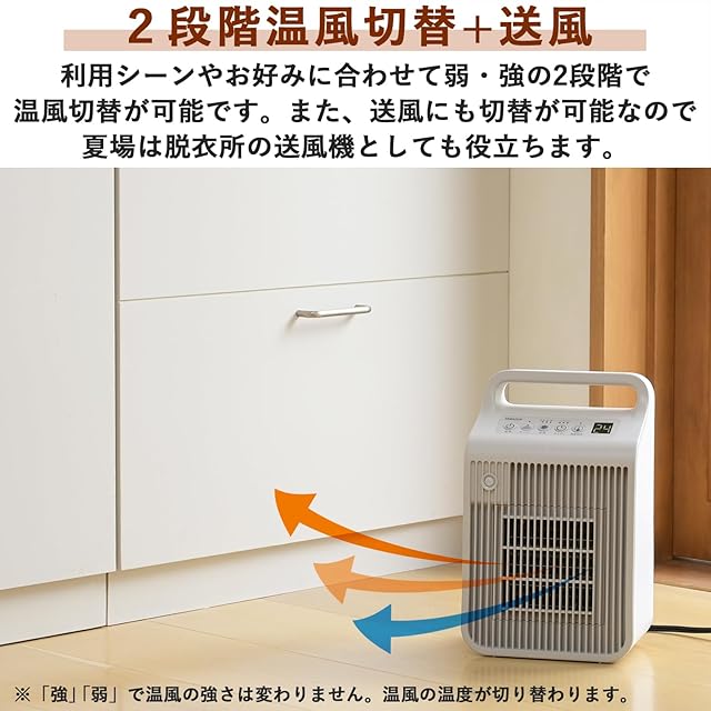 【温風切替】利用シーンに合わせて弱/強の2段階で温風切替が可能です。起床後・帰宅後は「強」、あたたまってきたら「弱」などお好みで設定してください。また送風にも切替が可能なので、夏場は脱衣所の送風機としても役立ちます。※「強」「弱」で温風の強さは変わりません。温風の温度が切り替わります。