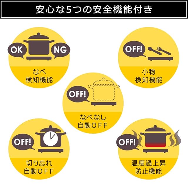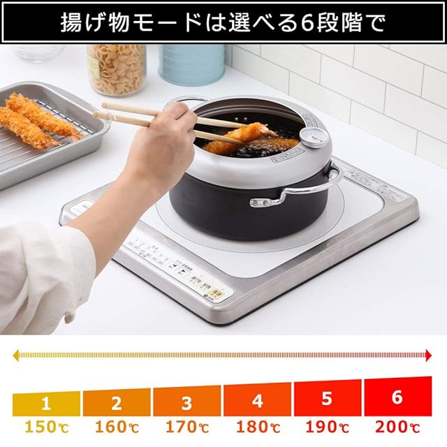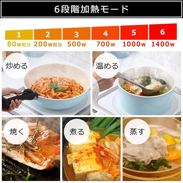 加熱調理モード:6段階(約1400W、約1000W、約700W、約500W、約200W相当、約80W相当)●揚げ物調理モード:6段階(約200℃、約190℃、約180℃、約170℃、約160℃、約150℃)●タイマー:1分~9時間50分●電源コード:2.0平方ミリメートル、2芯、ゴム平形コード●電源プラグ:2極(125V 15A)