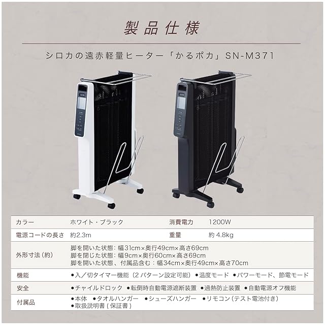 商品名:シロカ 遠赤軽量ヒーター かるポカ SN-M371(K) [節電モード新搭載/コード長50センチ増加/軽量4.8kg/乾燥しにくい/最大10畳対応/遠赤外線/タイマー設定可/] (ブラック(2022年モデル)