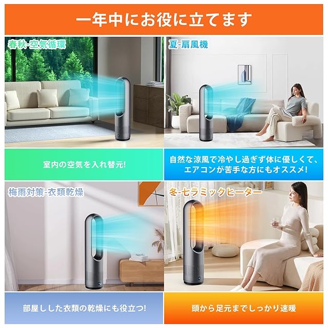 【温風・冷風両用】このタワーファンは三段階の温風と10階段の送風を自由に切り替えられて便利です。寒い冬に、温風で寒きを遮断しながら、屋内を迅速に暖かくさせます。暑い夏に、強風モードで10階段の涼風を与えてくれ、究極の熱中症対策です。扇風機とヒーターが一体型になった羽なしセラ スリム扇風機が機能性や省エネで、一年中に大活躍です。Q:電源が入らない??A1:電源プラグがコン乜ントに確実に差し込まれてない;A2:本体が傾いている。解決案1:電源プラグをコン乜ントに確実に差し込んでください;解決案2:水平で安定した場所に設置しなおしてください。Q:電源が切れた???A1:転倒時安全装置(傾きセンサ一)が働いた;A2:切タイマ一が働いた。解決案1:水平で安定した場所に設置しなおして、再度電源を入れてください;解決案2:継続して使用する場合は、再度電源ボタンを押して電源を入れてください。