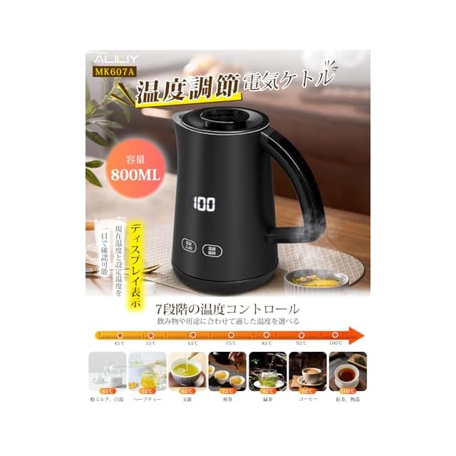 【便利な7段階温度調節・デジタル表示】日常生活でのお湯の使い道は様々ですが、沸騰機能しかない電気ケトルの場合、わざわざ温度を測らなければいけないので不便です。特に使用する機会が多い飲み物類や調理の際には、求められる最適な温度がそれぞれ異なります。Aliliy電気ポットは7段階(45/55/65/75/85/92/100℃)の温度設定機能付き、コーヒー・紅茶・ミルク・カップ麺などの用途に合わせて温度設定ができます。さらに、温度が本体に直接表示され、現在温度と設定温度を一目で確認できますので便利です。
