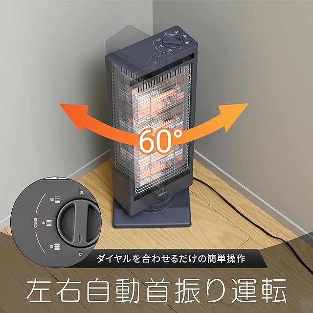 【左右首振り】広範囲にぬくもりを与えてくれる左右自動首振り運転。ダイヤルを首振り側に回すと左右60度の範囲で首振り運転し、家族や友人と集まる際もみんなであたたかく過ごせます。