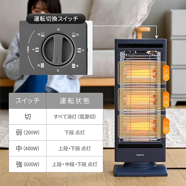 【運転切替】弱(下段 点灯(200W))・中(上段・下段 点灯(400W))・強(上段・中段・下段 点灯(600W))の3段階での運転切替が可能です。その日の気温や体調、お好みに合わせて設定してください。