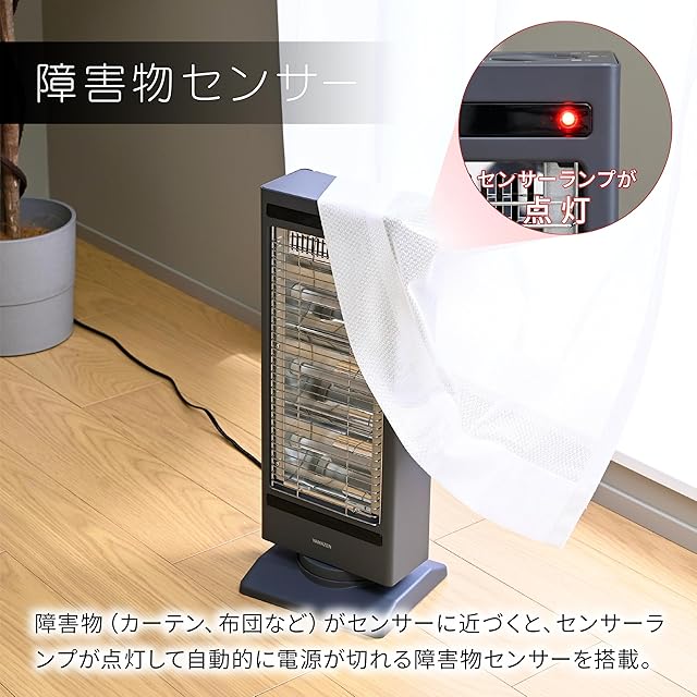 【障害物センサー】カーテン・布団・洗濯物などの障害物を検知すると自動で電源OFFになる障害物センサー搭載。"もしもの危険"に対応し火災防止に繋がります。