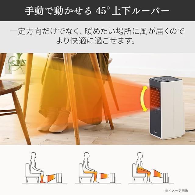 暖房の適用床面積目安(木造住宅/コンクリート住宅):[断熱材の厚みなし]約3畳(4.9m2)まで/約4.5畳(6.9m2)まで[断熱材の厚み50mm]約6畳(8.6m2)まで/約8畳(12.9m2)まで(※暖房の目安は、一般社団法人日本電機工業会の統一基準に準拠しています。室内外温度差15℃以内の地区で、暖房設定温度(暖房快適室温)20℃としたときを基準とし、1畳=1.65m2として小数点第1位を切り上げています。)