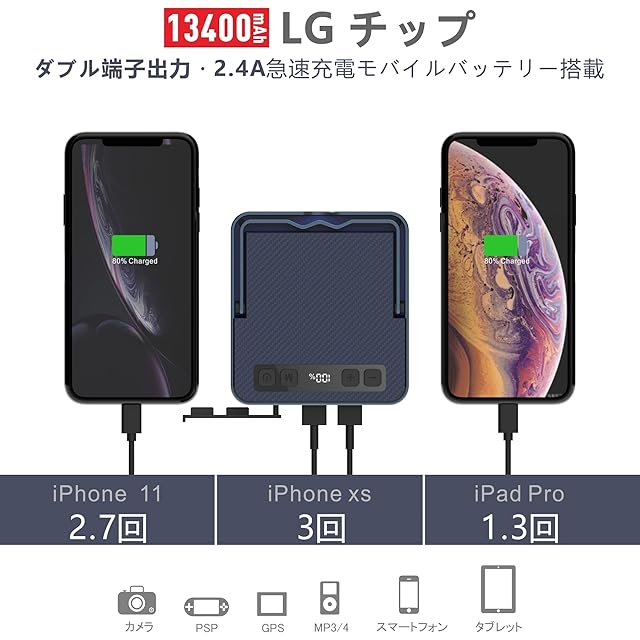 LG・13400mAh大容量バッテリー内蔵」:電池製品の使用安全性にとってはバッテリーの質と関わっています。LGブランドの3350mAhバッテリー(モデル:INR18650F1L)を使用したランタンは、長時間の照明を維持するのみならず、モバイルバッテリーとして使用可能です。最長照明時間は1500時間まで維持し、最高輝度は1200lumenに達します。充電では、iphone11へ2.7回/iphonexへ3回/ipad proへ1.3回充電可能です。