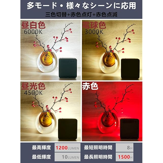 「三色切替、100段階調光」:ランタンを三色切り替えて、昼白色-昼光色-電球色-赤色点灯-SOS赤色点滅を順番に切り替えます。通常照明用の昼白色の照明温度は6000kで、自然白は4500k、暖色は3000kで、様々なシーンに適応します。赤色点灯は野営などの休みライトとして使用可能で、屋内のラブラブ雰囲気照明として使用可能です。また、地震や災害などの緊急事態にあう時期では、赤色点滅のSOSを使用して提示として使用可能です。