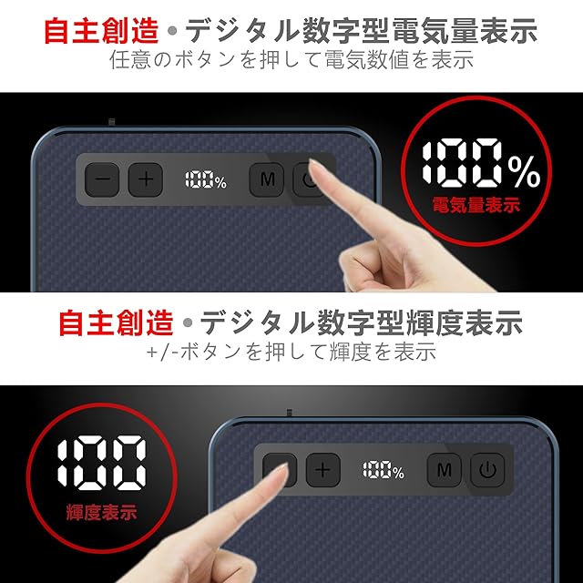 「デジタル数字電気量/輝度表示」:目前が最新技術を採用してランタンの電気量をLEDデジタルの方式で表示され、電気量をはっきり確認しますので、残量を知りながら充電を行います。また、輝度も1から100のデジタル数字で確認しますので、お好みに調節可能で便利です。