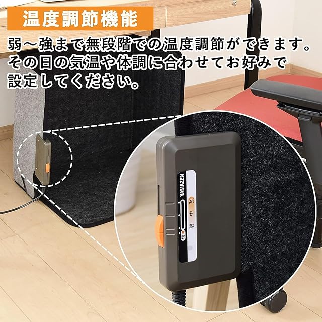 【温度調節】弱~強まで無段階での温度調節ができます。その日の気温や体調に合わせて設定してください。操作もスライド式のシンプル操作なので、どなたでも簡単にお使いいただけます。
