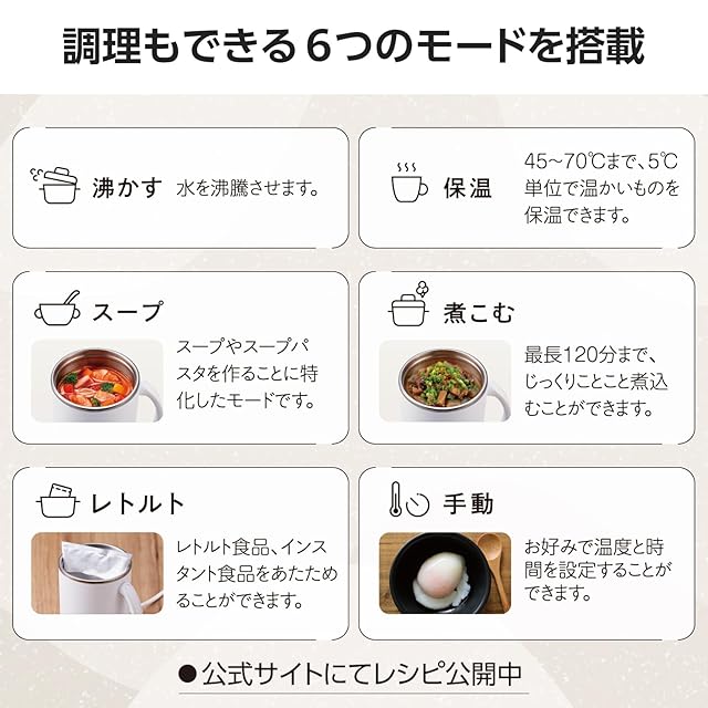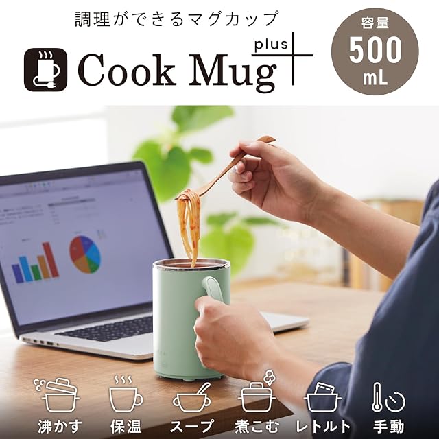 できたてアツアツを、いつでも卓上で。6つのモードで飲み物の温めだけでなく調理も簡単にできる、マグカップ型電気なべ・Cook Mug plusです。飲み物もスープもたっぷり楽しめる500mlの大容量モデル。自宅やオフィス、旅行先など幅広いシーンで活躍します。