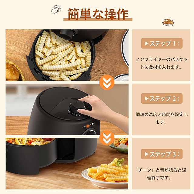 【早くて効率的な調理】 1200wの高速加熱、360度の熱風循環加熱技術、最大200℃の熱風が出る高熱伝導のステンレス製加熱管により、食材を迅速かつ均等に調理します。また、短時間でサクサクの食感を実現できます!油で揚げるよりも短時間で仕上げることができ、忙しい現代人にとって時間を節約する利点があります。