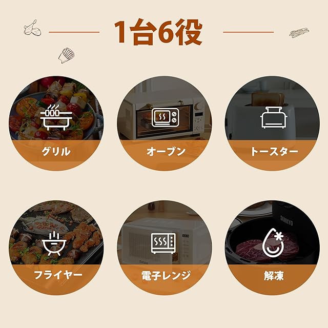 【コンパクト・1台6役】 ・1~2人暮らしに最適な2L超軽量・小型サイズ。縦・横・高さが20*20*26cmと、A4用紙より小さい!場所を取らずに簡単に収納できます。 ・エアフライヤーは単なる揚げ物だけでなく、焼く、グリルする、温めるなどの様々な調理方法に対応しています。1台で複数の調理器具に代わり、台所のスペースを節約することができます。