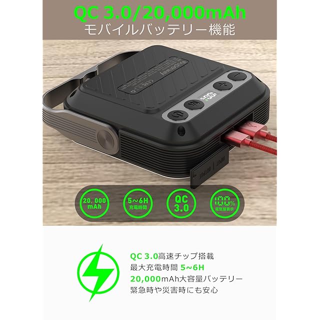 【20000mAh/3.7V QC3. 0/22.5W】USB充電式アウトドアledキャンピングライト。QC3.0スマートチップを搭載し、最大出力22.5Wで、アウトドアや緊急時にスマートフォンの充電を迅速に行える,充满电时间约为5-6h,USB-A&USB-C出力22.5w(Max)。