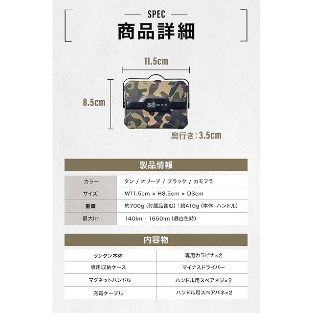 WAQ LEDランタン 2 暖色 電球色 昼光色 USB充電式 (1650ルーメン/13400mah/連続点灯24時間/PSE) 防水 LED LANTERN2 WAQ-LL02 (CAMO(カモフラ))