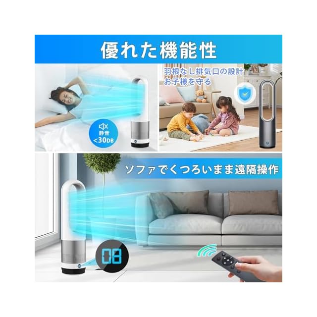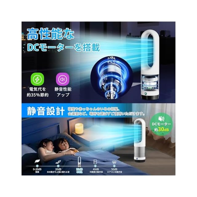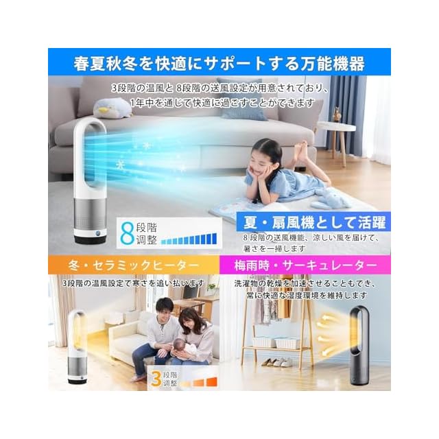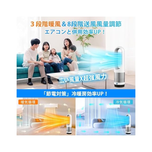 扇風機 羽なしタワーファン【2025冷暖兼用・羽根無し】8段階送風&3段階温風切替 左右100°首振り 9Hタイマー機能 温風 冷風 広範囲送風 羽根なし リビング扇風機 強力送風 大風量 リモコン付 暖風送風 ファンヒーター 過熱保護 転倒安全装置 即暖 省エネ 節電 子供部屋 リビング 寝室 キッチン 脱衣所 洗面所 トイレ オフィスに適用 PSE認証済 日本語説明書