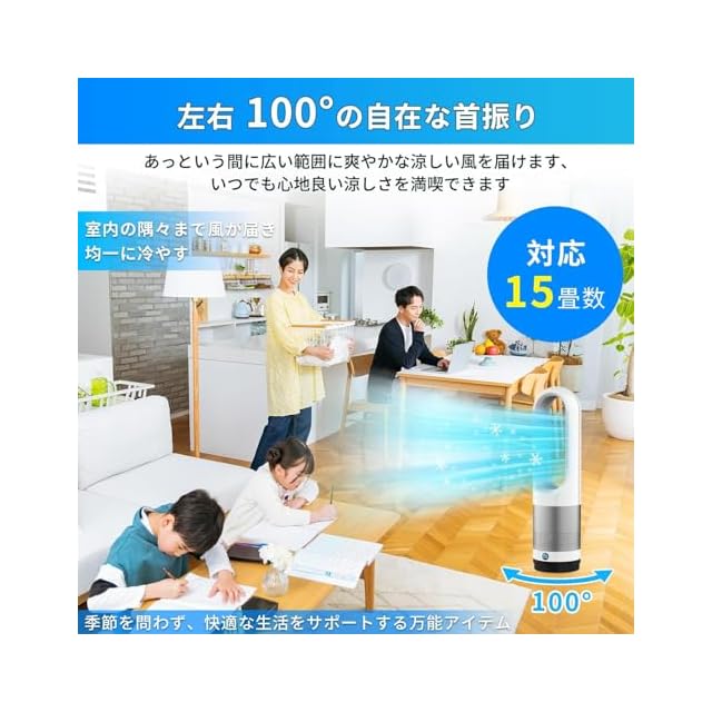 【100°の自動首振り9時間タイマー&便利な機能】羽根なし扇風機には、左右100°の自動首振り機能、9時間タイマー機能、8m以内のリモコン操作機能が充実しています。自動首振り機能により、広い範囲に送風することができ、部屋全体に涼しさや暖かさを届けます。1-9時間のタイマー「切」設定が可能なので、出勤時や夜間の就寝時、勉強時など、様々なシーンで使い勝手が良いです。また、リモコン操作により、ベッドやソファーから離れることなく、自由に操作することができます。DCモーター式扇風機の高性能と省エネ性能を活かし、このタワーファンは、羽根なし扇風機として長時間使用してもお手軽です。