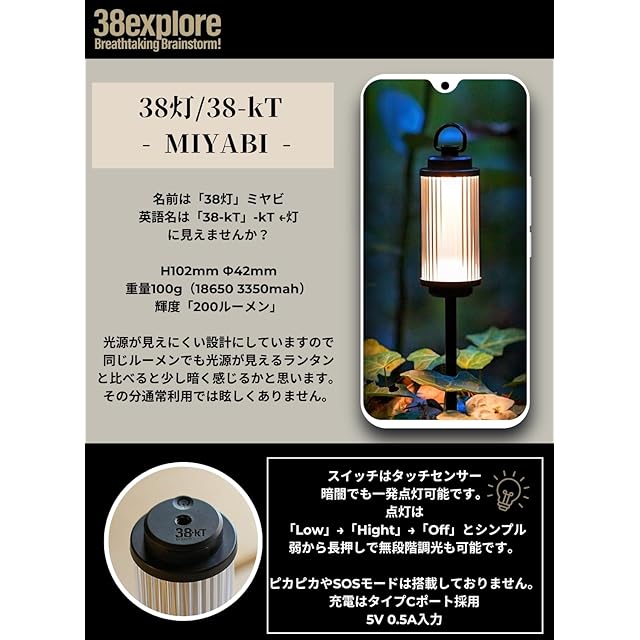 【輝度】200ルーメン(lm)光源が見えにくい設計にしているので同じルーメンでも光源が見えるランタンと比べると少し暗く感じるかと思います。その分通常利用で眩しくはありません。