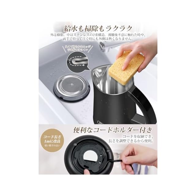 【コードホルダー付き・広口設計】電気ポットは従来品より電源コード長さは0.8M⇒1.3Mに改善し汎用性が高くて便利です。便利なコードホルダーも付き、コードを収納でき、長さを調整できるから便利(※コードを完全に収納することはできません)。ふたが取り外しできて、広口10CM設計なので水を入れやすいのはもちろん、内側のお手入れも簡単にできます。