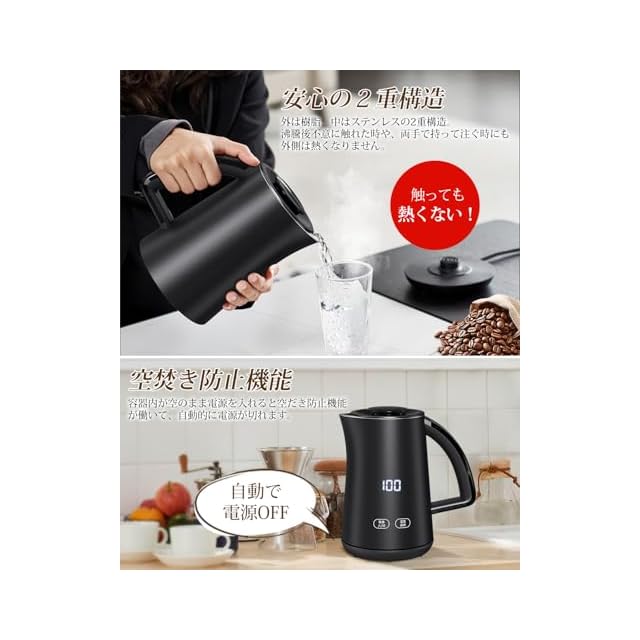 【304食品級ステンレス・安全保護】電気ケトルステンレス製内容器に樹脂製のカバーを備えた安心の二重構造となっており、外が触れても熱くならないでやけどのリスクを低減。安全面に優れた「空だき防止機能」や「自動電源OFF機能」も搭載。水がなくなったら自動的に電源をオフにし、空だきによる本体破損や火災を防止します。沸とう後に自動的に電源をオフにし、電気代の節約にも繋がります。