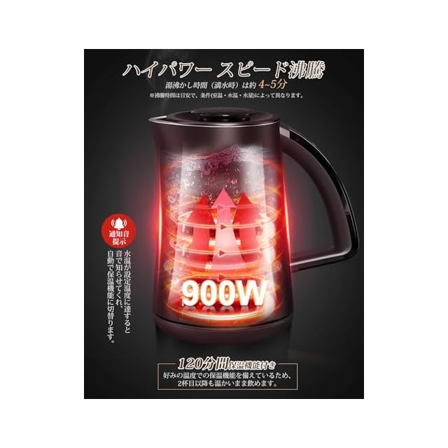 【900Wスピード湯沸かし・2時間保温機能】湯沸かしケトルは900Wのハイパワーにより、満水時(800ml)でも約3〜5分と素早く沸騰させます。※室温25℃、水温25℃の場合。沸騰時間はあくまで目安で条件(室温・水温・水量)によって異なります。設定温度になると、ケトルが「ピーッ」と音で知らせ、自動で保温機能に切り替わります。120分の保温機能を備えているので、2杯目のお茶やコーヒー、スープも再沸とうの必要がなくすぐに楽しめます。