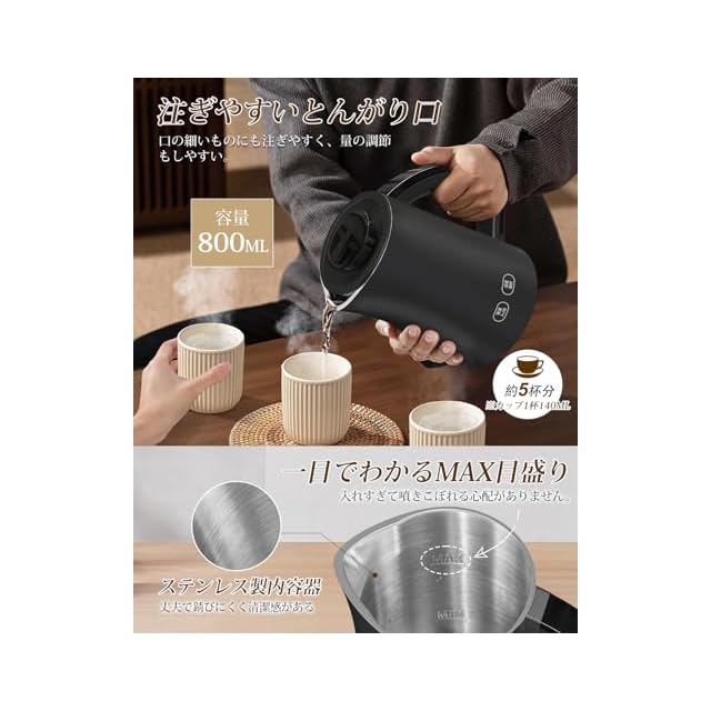 【小型0.8L容量・シンプルでマットな質感】コンパクトながら容量0.8Lとコーヒーカップ約5杯分(1杯150ml)、マグカップなら約3杯分(1杯250ml)が沸かせます。小型なのに一人暮らし・二人暮らしの方、少人数家族でおもにコーヒー・お茶に使う場合にもOK。湯沸かしポット内側には満水容量がわかる「MAX」の表示付き、水の入れすぎを防ぎます。無駄のないシンプルなデザインでインテリアに馴染む、上品なマットな質感・ブラックと木目の組み合わせはモノトーンインテリアに比べて高級感を醸し出します。