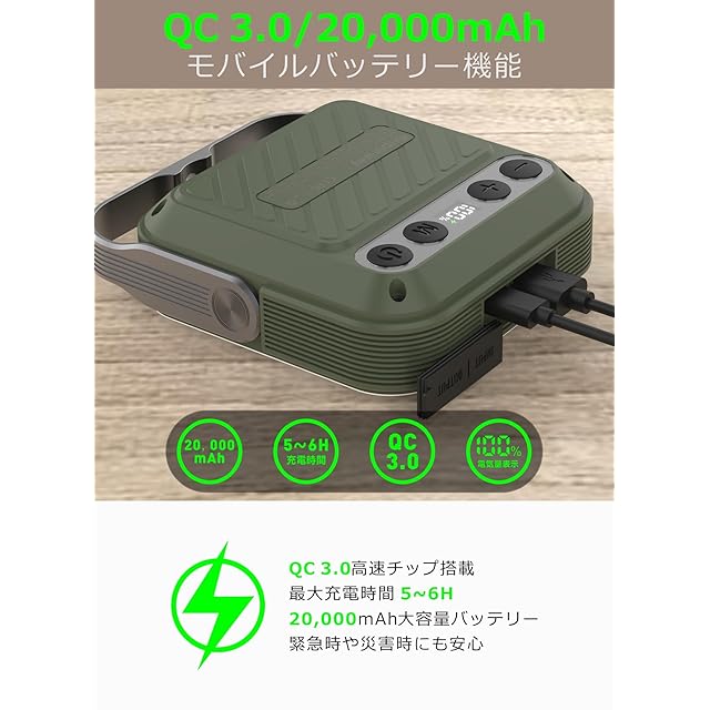 【20000mAh/3.7V QC3. 0/22.5W】USB充電式アウトドアledキャンピングライト。QC3.0スマートチップを搭載し、最大出力22.5Wで、アウトドアや緊急時にスマートフォンの充電を迅速に行える,充满电时间约为5-6h,USB-A&USB-C出力22.5w(Max)。